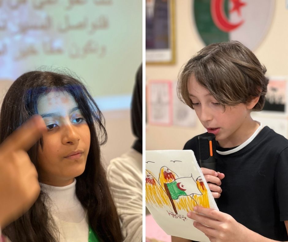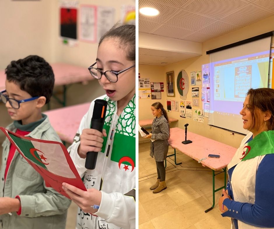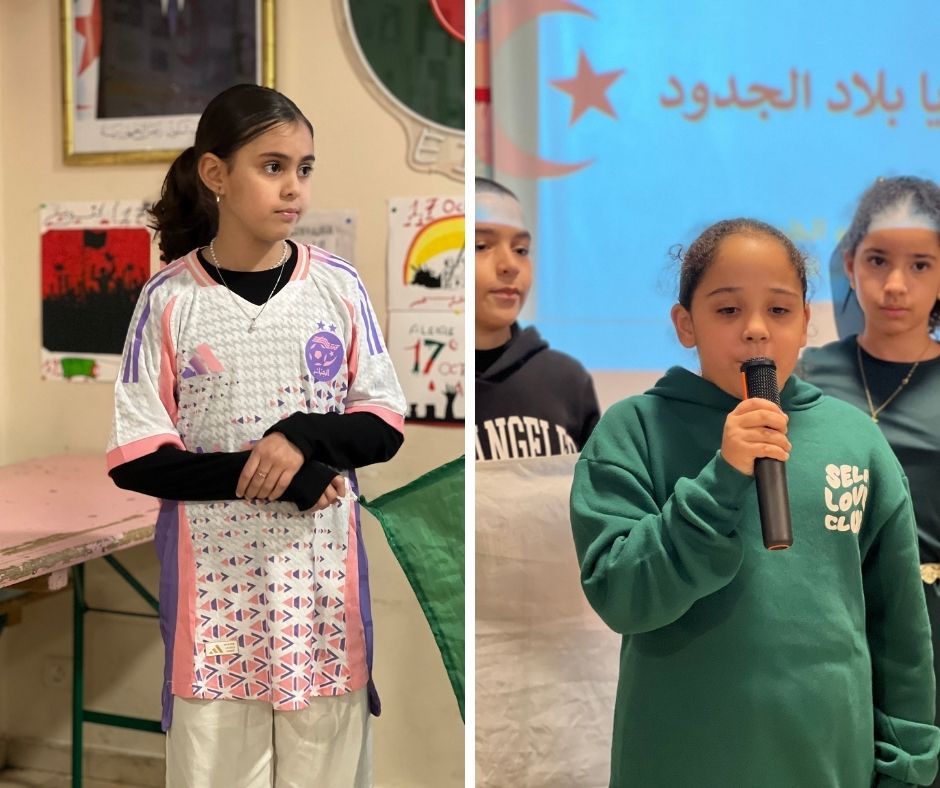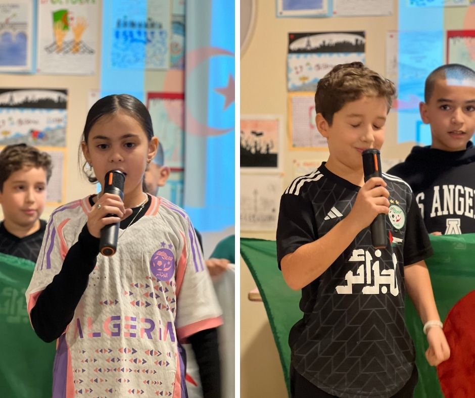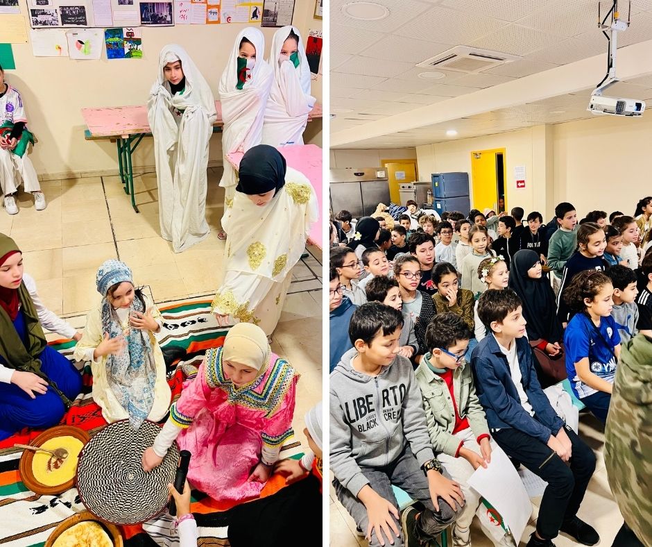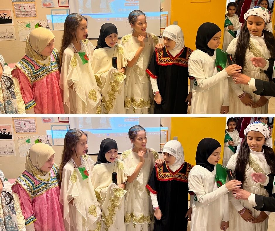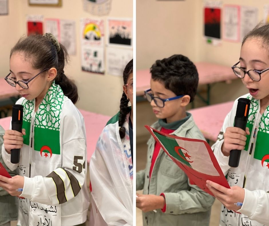 Après la récitation de versets coraniques, l’hymne national algérien et le mot d’ouverture de Mme la Directrice, les élèves du primaire ont proposé une série de lectures, chants, poèmes, dessins et expositions évoquant les luttes du peuple algérien pour la liberté et la dignité.
