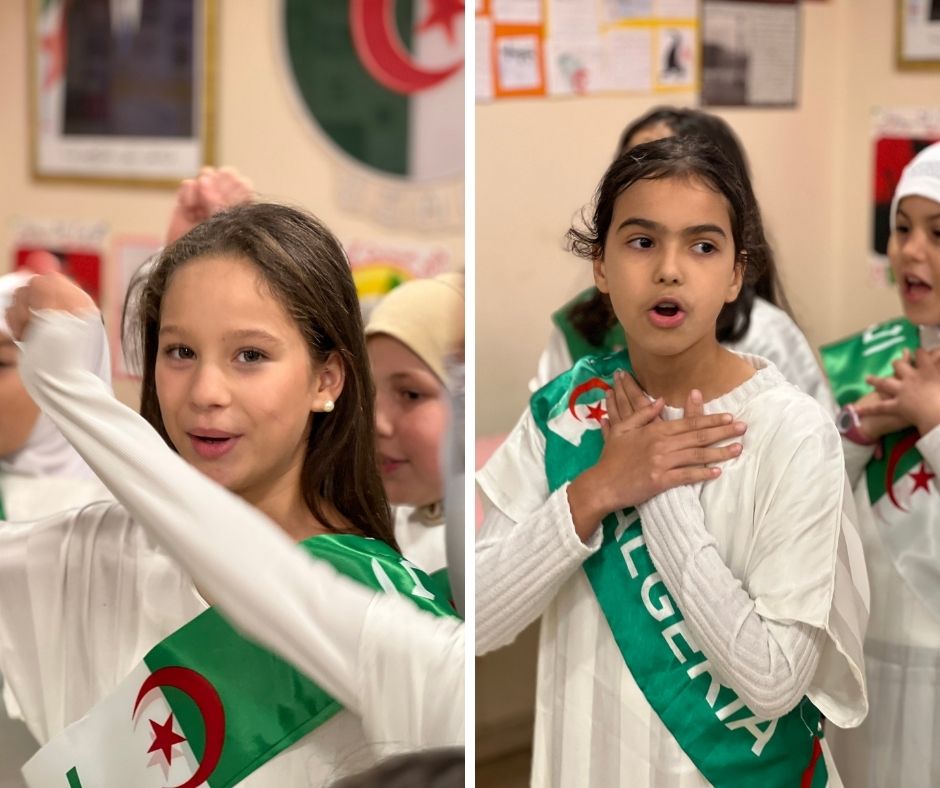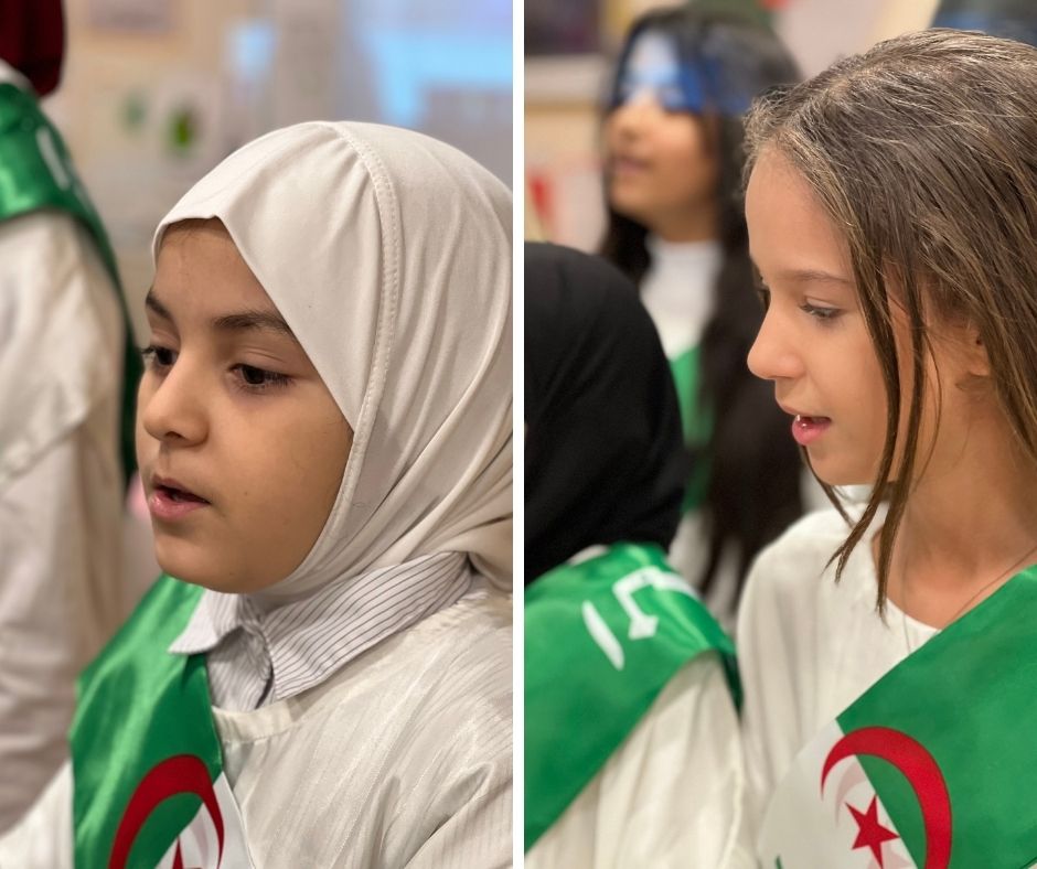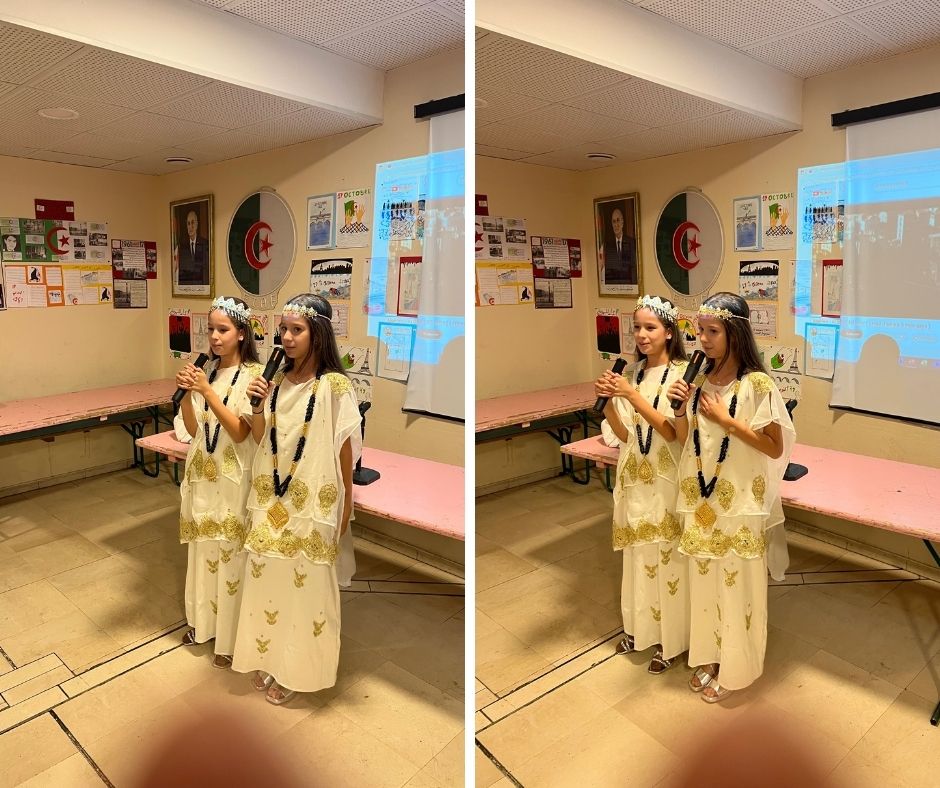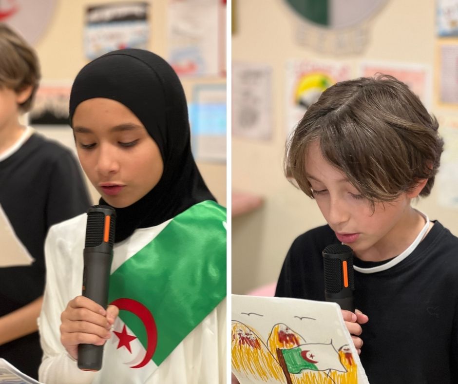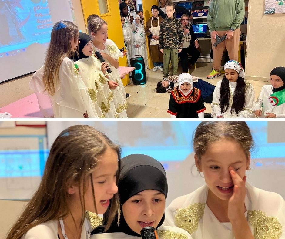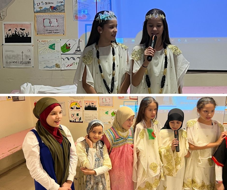 Après la récitation de versets coraniques, l’hymne national algérien et le mot d’ouverture de Mme la Directrice, les élèves du primaire ont proposé une série de lectures, chants, poèmes, dessins et expositions évoquant les luttes du peuple algérien pour la liberté et la dignité.