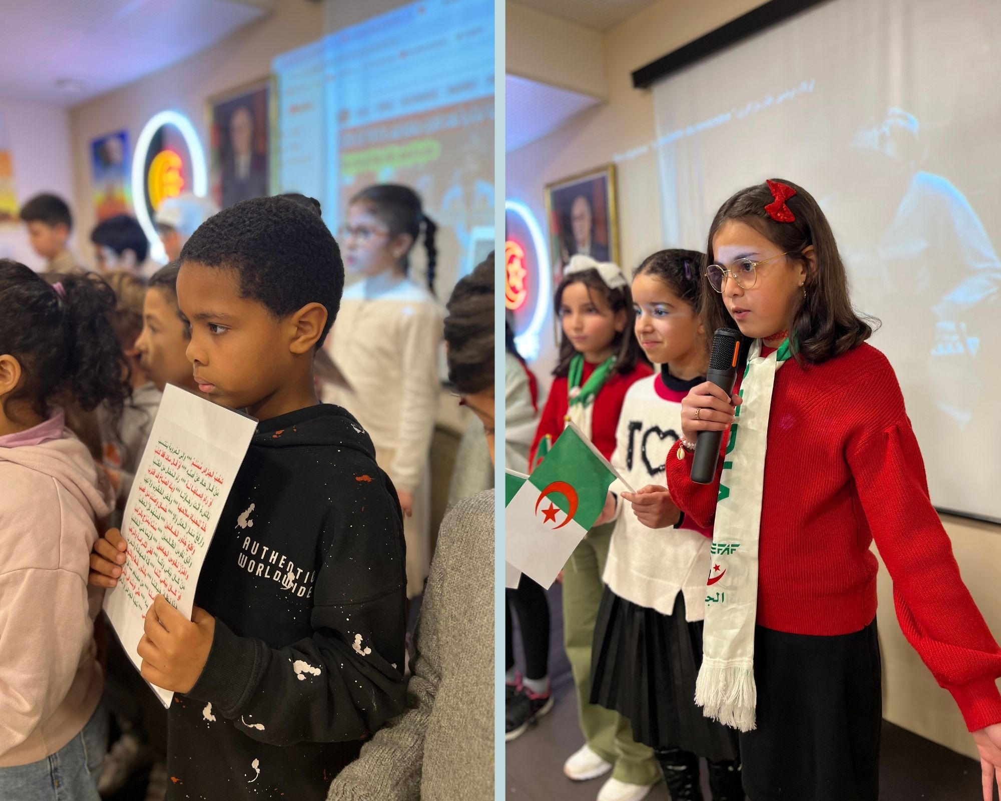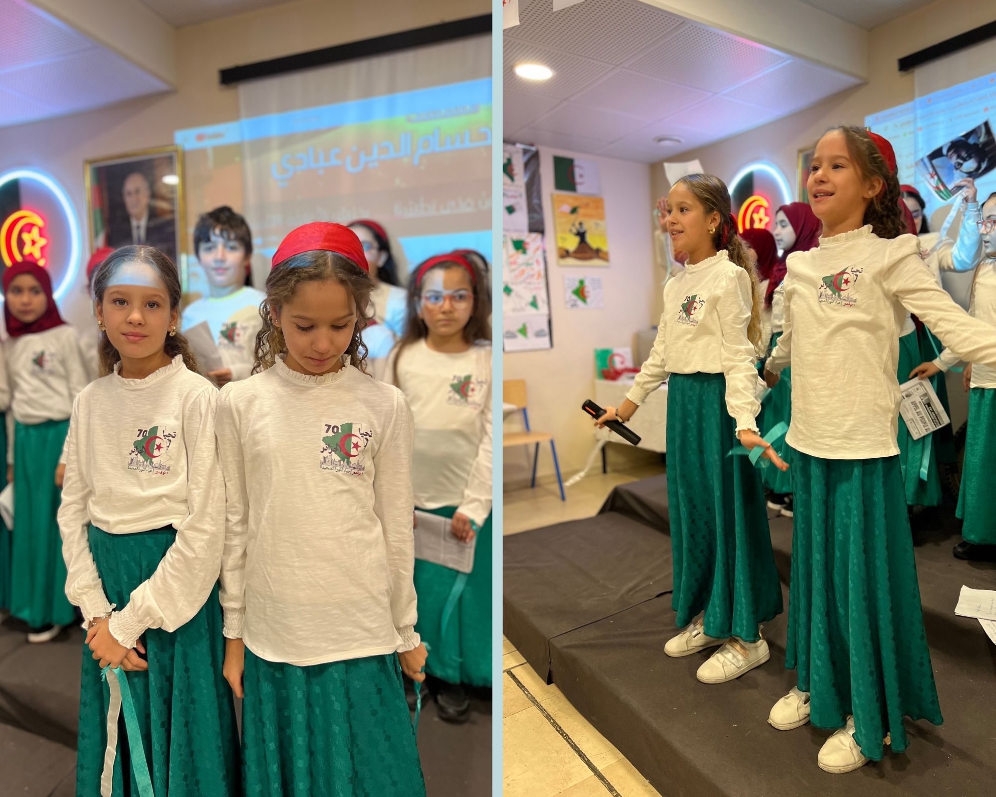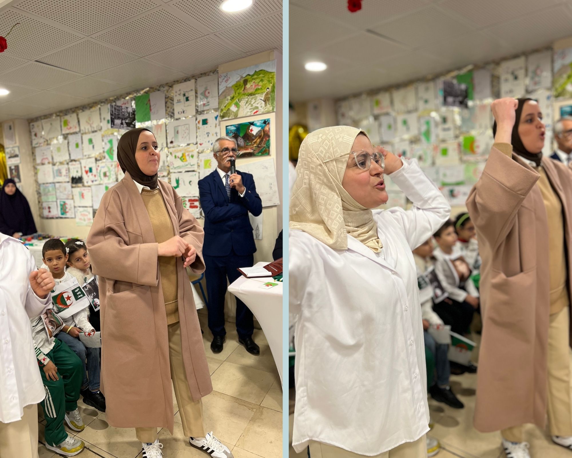 La journée a débuté avec les élèves de 1AP1, qui ont récité des versets coraniques avant de chanter l’hymne national et l’hymne des martyrs, tout en brandissant des drapeaux nationaux. Ils ont poursuivi avec l’hymne « Mes frères, n’oubliez pas les martyrs ».