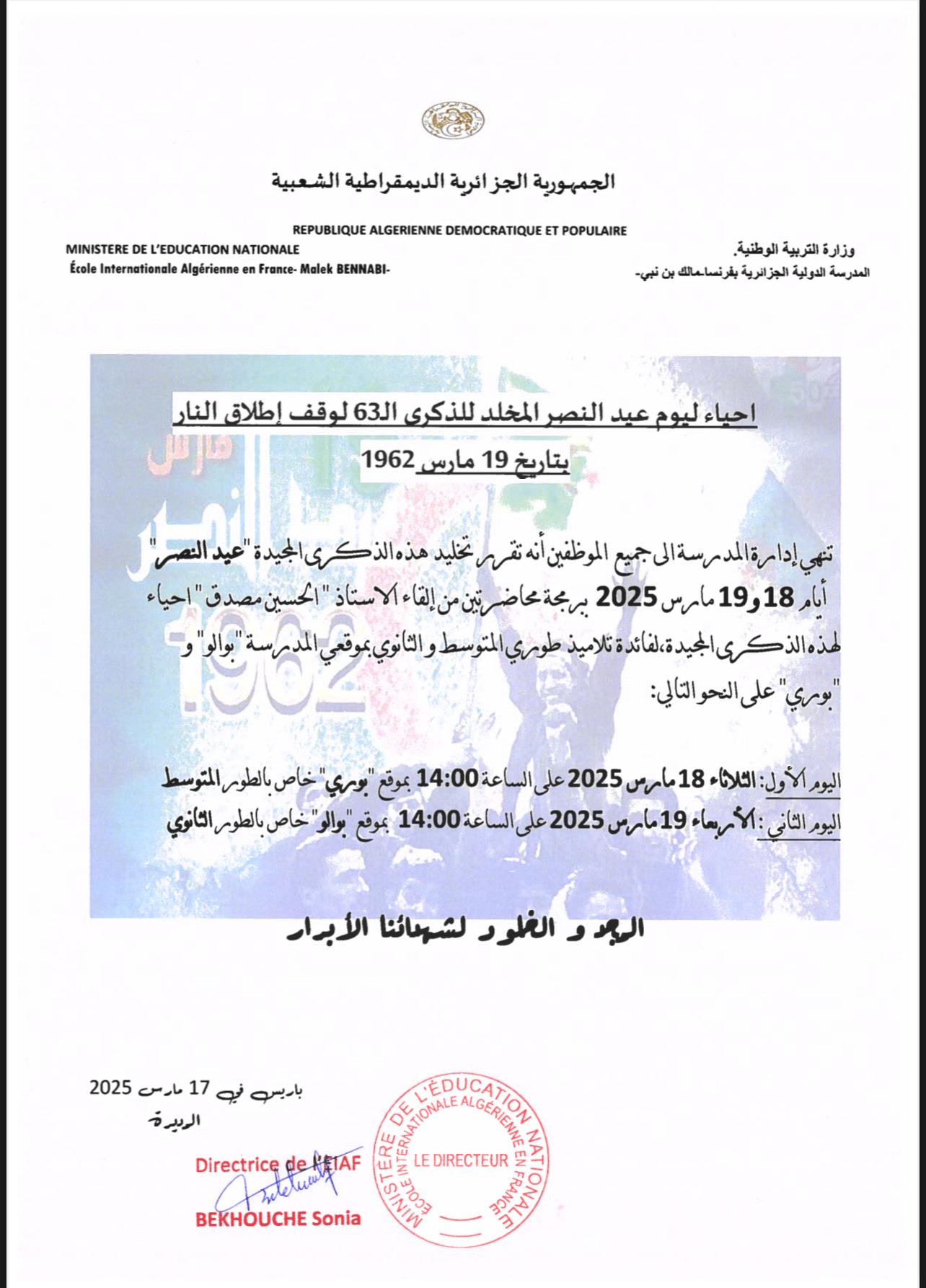 Cette année marque le 63e anniversaire du cessez-le-feu historique du 19 mars 1962, date qui a conduit à l’indépendance nationale. Pour commémorer cet événement majeur, notre école a prévu une série de célébrations et de réflexions sous le thème de la « Journée de la Victoire. »