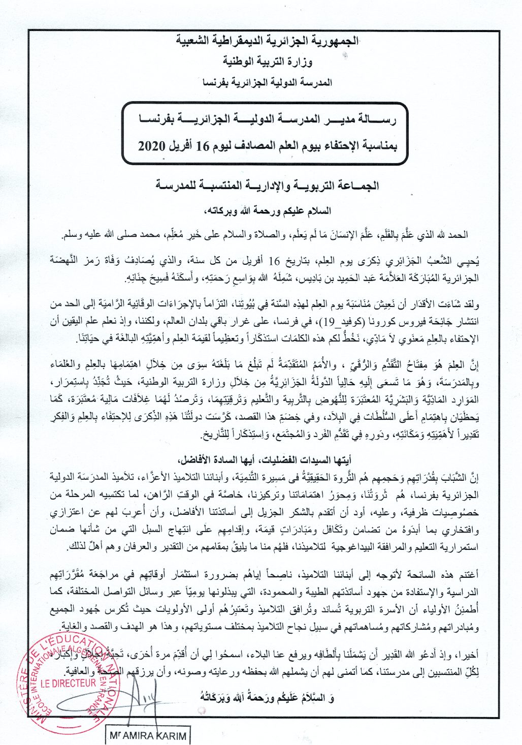Le directeur de l’Ecole Internationale Algérienne en France, M. Karim Amira, a adressé jeudi un message à l’occasion de la célébration de la Journée du Savoir (16 avril) dont voici le texte intégral :