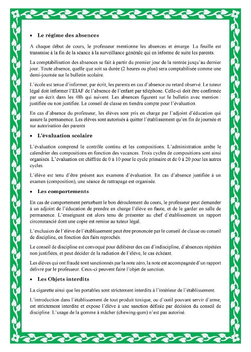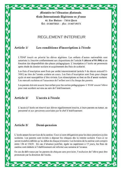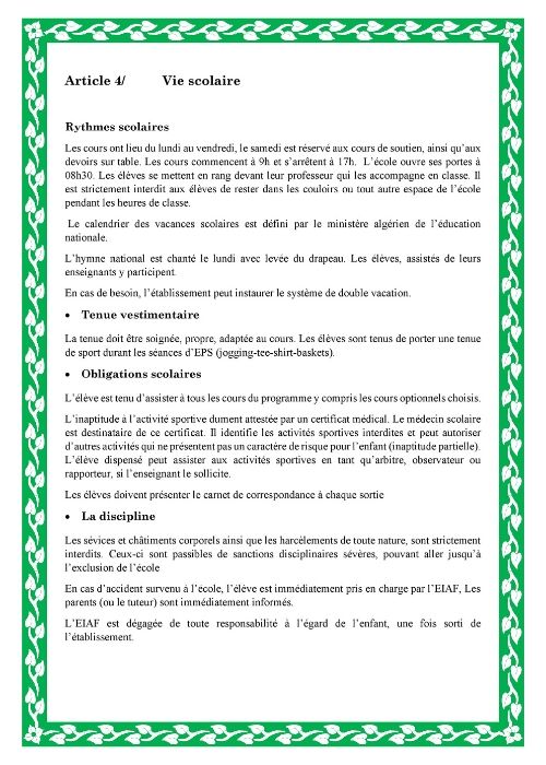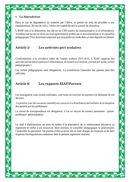 Ce règlement est appelé à être signé à chaque rentrée scolaire par les parents ou le tuteur légal de l’élève. L’ensemble de la communauté éducative de l’école veille à son respect et son application. L’EIAF est garante de l’intégrité physique et morale de l’élève et veille à son épanouissement.