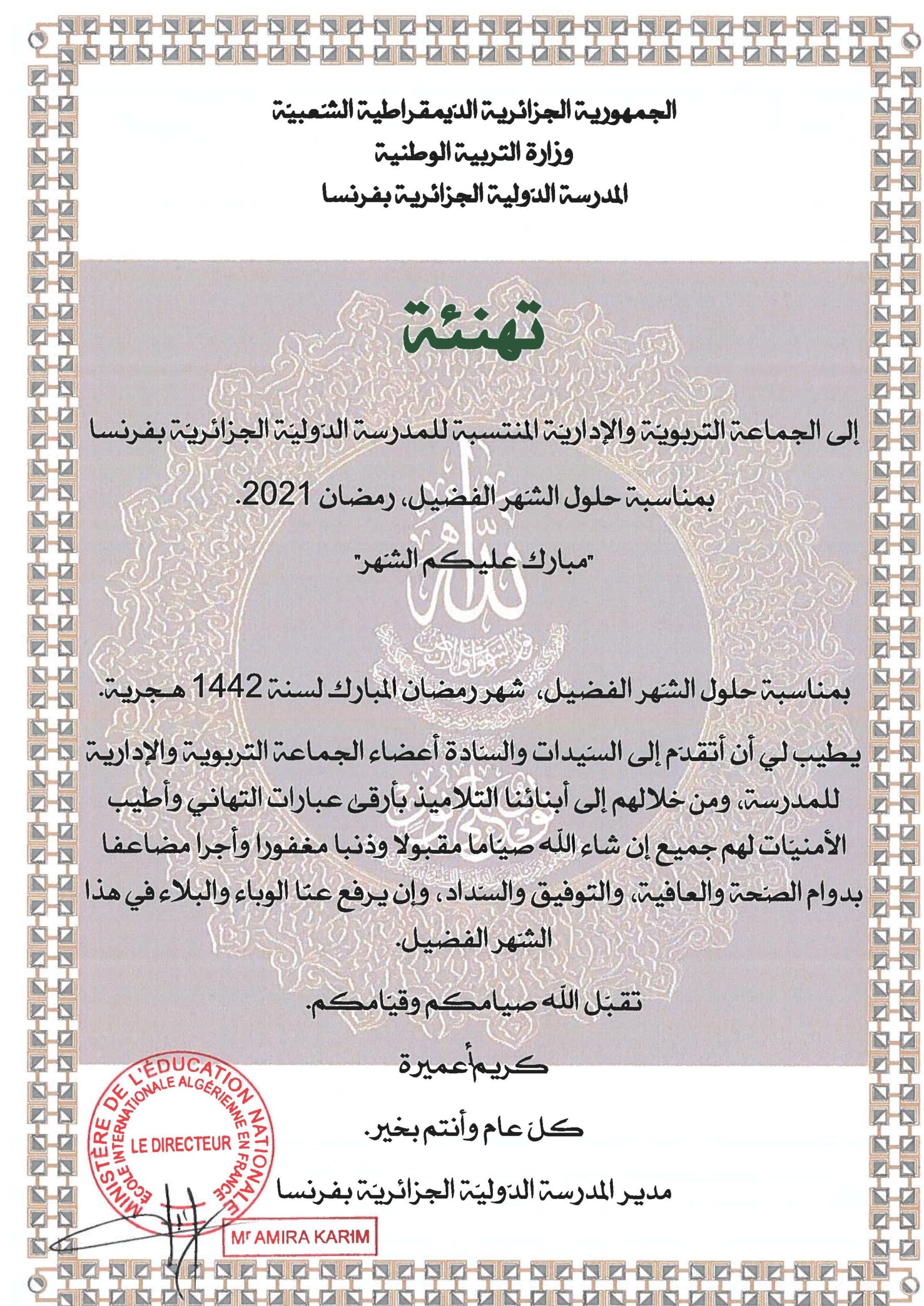 Dans ce message, le directeur de l’École Internationale Algérienne en France, M. Karim Amira,  exprime ses chaleureuses félicitations et ses meilleurs vœux de santé et de bonheur à l’équipe éducative et administrative dont voici le texte intégral :